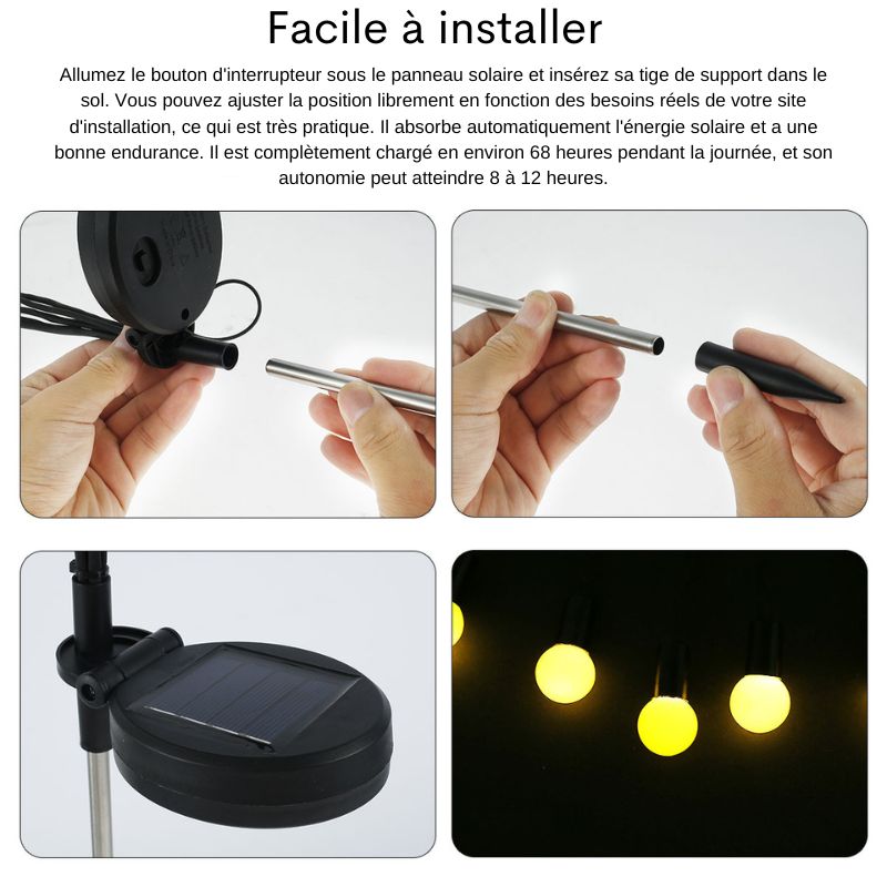 Les lampes Solargarden™ sont conçues pour être faciles à installer et à utiliser. Aucun câble ou prise n'est nécessaire, permettant une installation rapide et sans souci, adaptée à tous les utilisateurs.